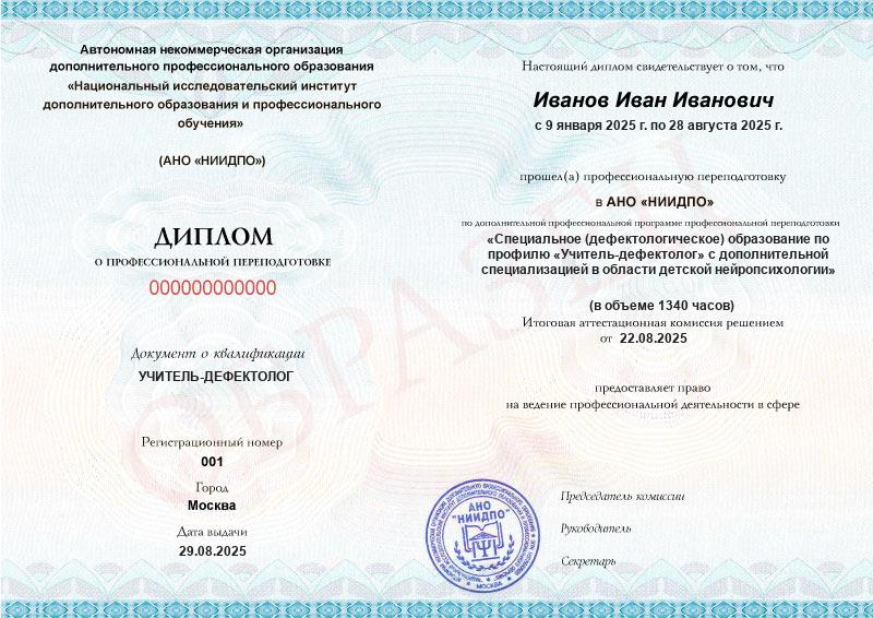 Специальное (дефектологическое) образование по профилю «Учитель-дефектолог» с дополнительной специализацией в области детской нейропсихологии (1340ч)