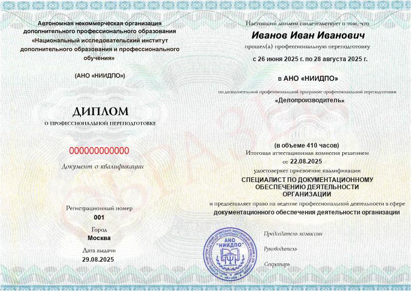 Да, документы оформляются на бланках с защитой от подделок, заполняются на русском языке, в них ставится печать АНО «НИИДПО».