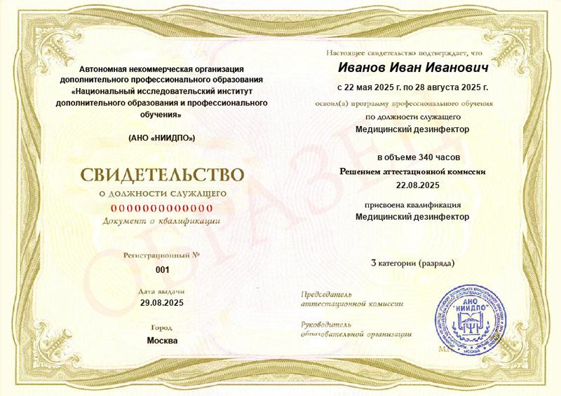 - Квалификация: Медицинский дезинфектор