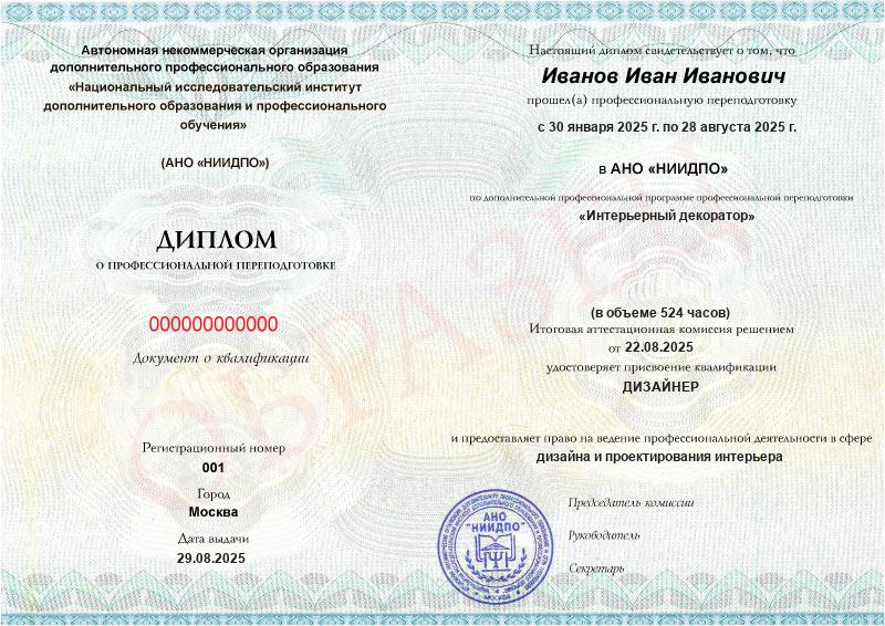 Да, документы оформляются на бланках с защитой от подделок, заполняются на русском языке, в них ставится печать АНО «НИИДПО».