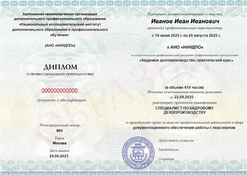 Да, документы оформляются на бланках с защитой от подделок, заполняются на русском языке, в них ставится печать АНО «НИИДПО».