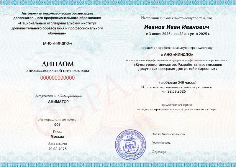 - Квалификация: АНИМАТОР