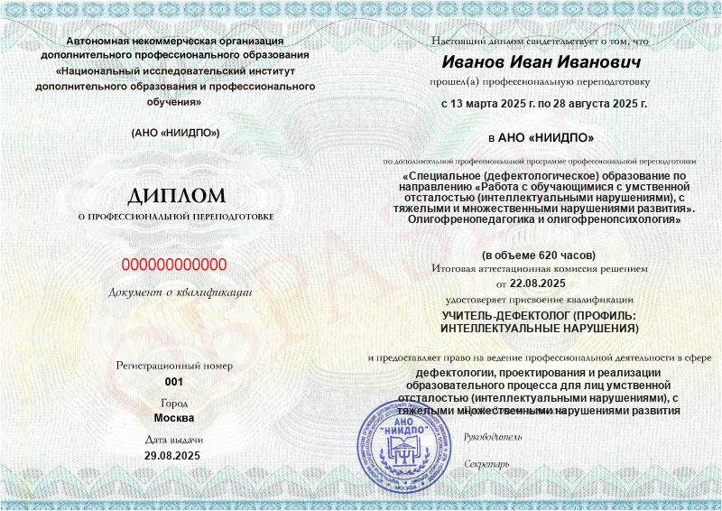 Специальное (дефектологическое) образование по направлению «Работа с обучающимися с умственной отсталостью (интеллектуальными нарушениями), с тяжелыми и множественными нарушениями развития». Олигофренопедагогика и олигофренопсихология (620ч)