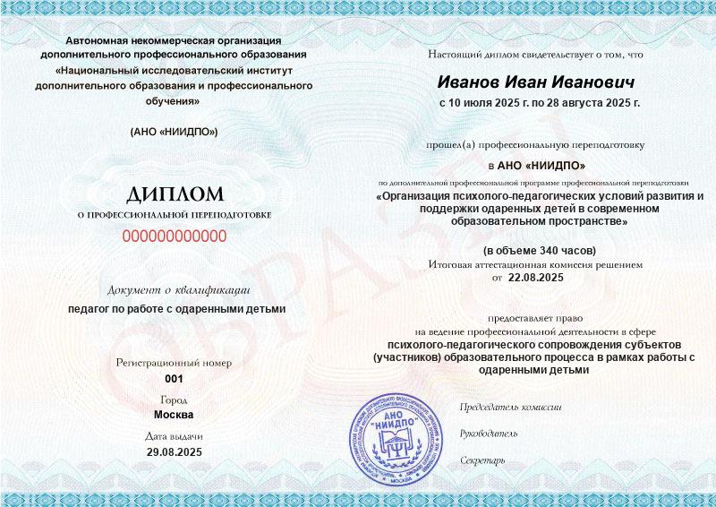 Сегодня в России в рамках проекта Минобрнауки «Наша новая школа» уделяется повышенное внимание развитию школ-интернатов для одаренных детей. Кроме бюджетных, создается множество частных или организованных при высших учебных заведениях школ. Все они ориентированы на создание психолого-педагогических условий для поддержки одаренных детей и адекватной реализации их творческого и интеллектуального потенциала. Педагоги, прошедшие курс профпереподготовки, способны эффективно работать в образовательных организациях для одаренных детей, способствуя их всестороннему развитию и реализации способностей. Выпускники смогут составлять программы обучения одаренных детей, оказывать им поддержку в становлении личности и вхождении в социум.