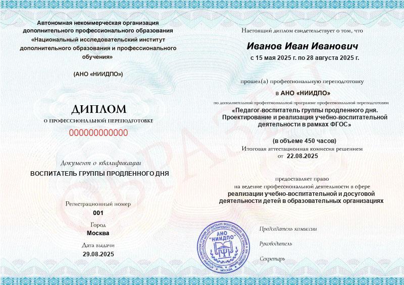Студент, желающий поступить в АНО «НИИДПО», должен предоставить справку из образовательной организации. Независимо от срока окончания обучения по программе дополнительного образования, диплом о профпереподготовке выдаётся только после предъявления документа о получении среднего профессионального или высшего образования.