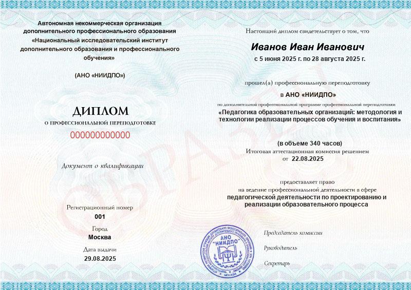 Студент, желающий поступить в АНО «НИИДПО», должен предоставить справку из образовательной организации. Независимо от срока окончания обучения по программе дополнительного образования, диплом о профпереподготовке выдаётся только после предъявления документа о получении среднего профессионального или высшего образования.