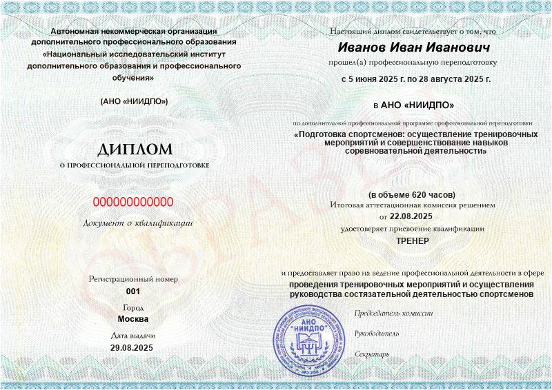 Выпускникам, успешно прошедшим итоговую аттестацию по дополнительным профессиональным программам, выдается документ о квалификации - диплом о профессиональной переподготовке или удостоверение о повышении квалификации. В соответствии с приказом Минобрнауки России от 24.03.2025 № 266 «Об утверждении Порядка организации и осуществления образовательной деятельности по дополнительным профессиональным программам», документ о квалификации выдается на бланке, образец которого самостоятельно устанавливается образовательной организацией.
