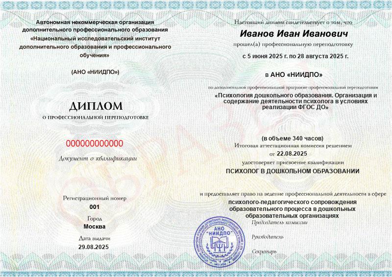 Студент, желающий поступить в АНО «НИИДПО», должен предоставить справку из образовательной организации. Независимо от срока окончания обучения по программе дополнительного образования, диплом о профпереподготовке выдаётся только после предъявления документа о получении среднего профессионального или высшего образования.