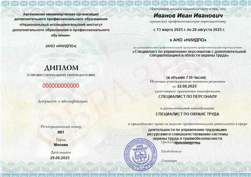 На курсе вы получите диплом о профессиональной переподготовке с присвоением сразу двух квалификаций: Специалист по управлению персоналом и Специалист по охране труда.