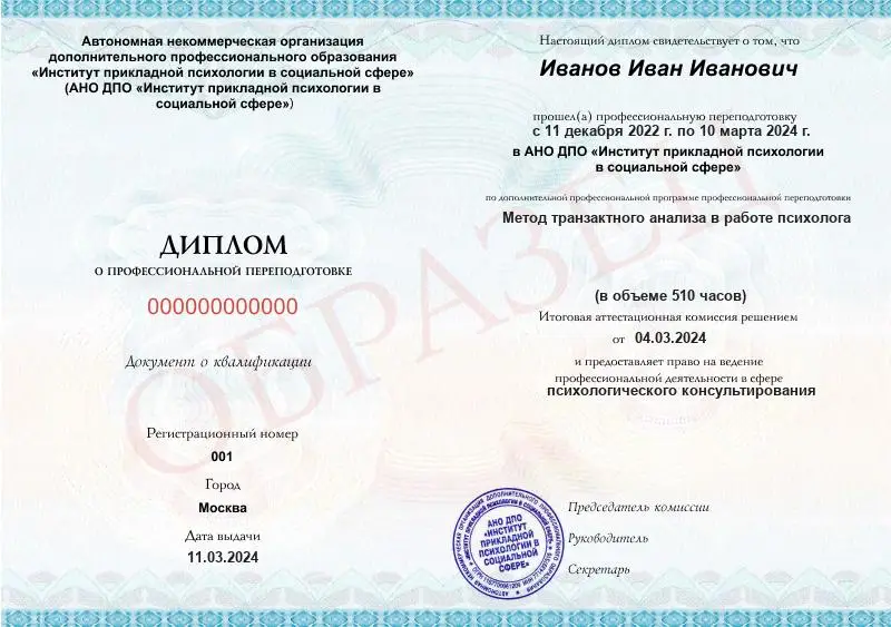 - Готовы начать профессиональную практику в методе транзактного анализа — у вас есть глубокие знания и практические инструменты для работы с различными запросами, а также диплом, подтверждающий компетенции.