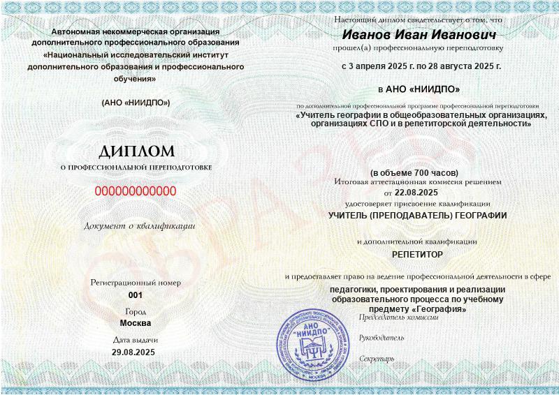 - 2 квалификации: Учитель (преподаватель) географии + Репетитор