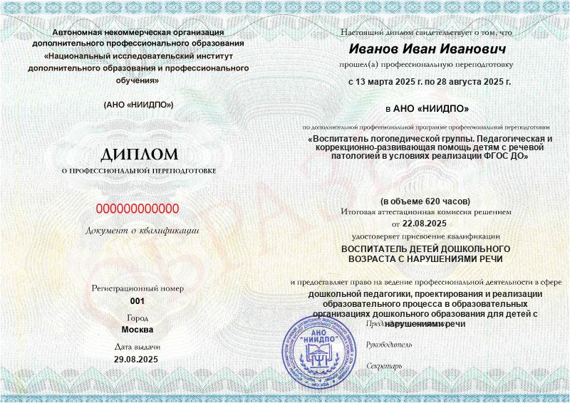 - Квалификация: Воспитатель детей дошкольного возраста с нарушениями речи